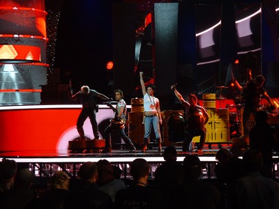 Greenjolly singing their song with Malta's Chiara. upstarirs the